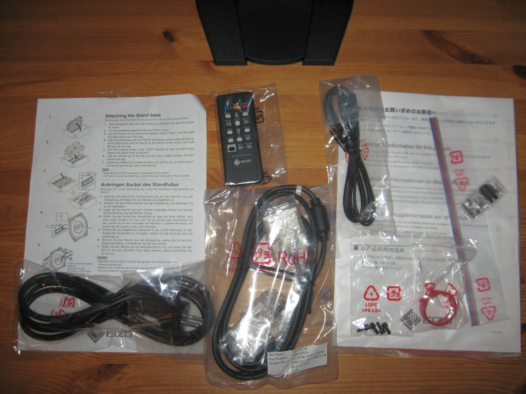 Optisch schlicht, aber stabil verpackt kommt der Monitor bei uns an. Nach dem Öffnen entdecken wir zuerst einen sehr funktionalen Standfuß. Bevor wir an das Display kommen, zeigt sich jede Menge Zubehör im Karton: ein DVI-D-Kabel, Handbücher, eine Schnellanleitung, Fernbedienung, Farbstreifen zum „Modden“, eine Utility-CD, Audio- und Signalkabel, ein ICC-Farbprofil und eine Batterie. Ein Lieferumfang der eigentlich keine Wünsche offen lässt. Das Display, wie auch der Standfuß, kommen gleichermaßen schlicht daher.