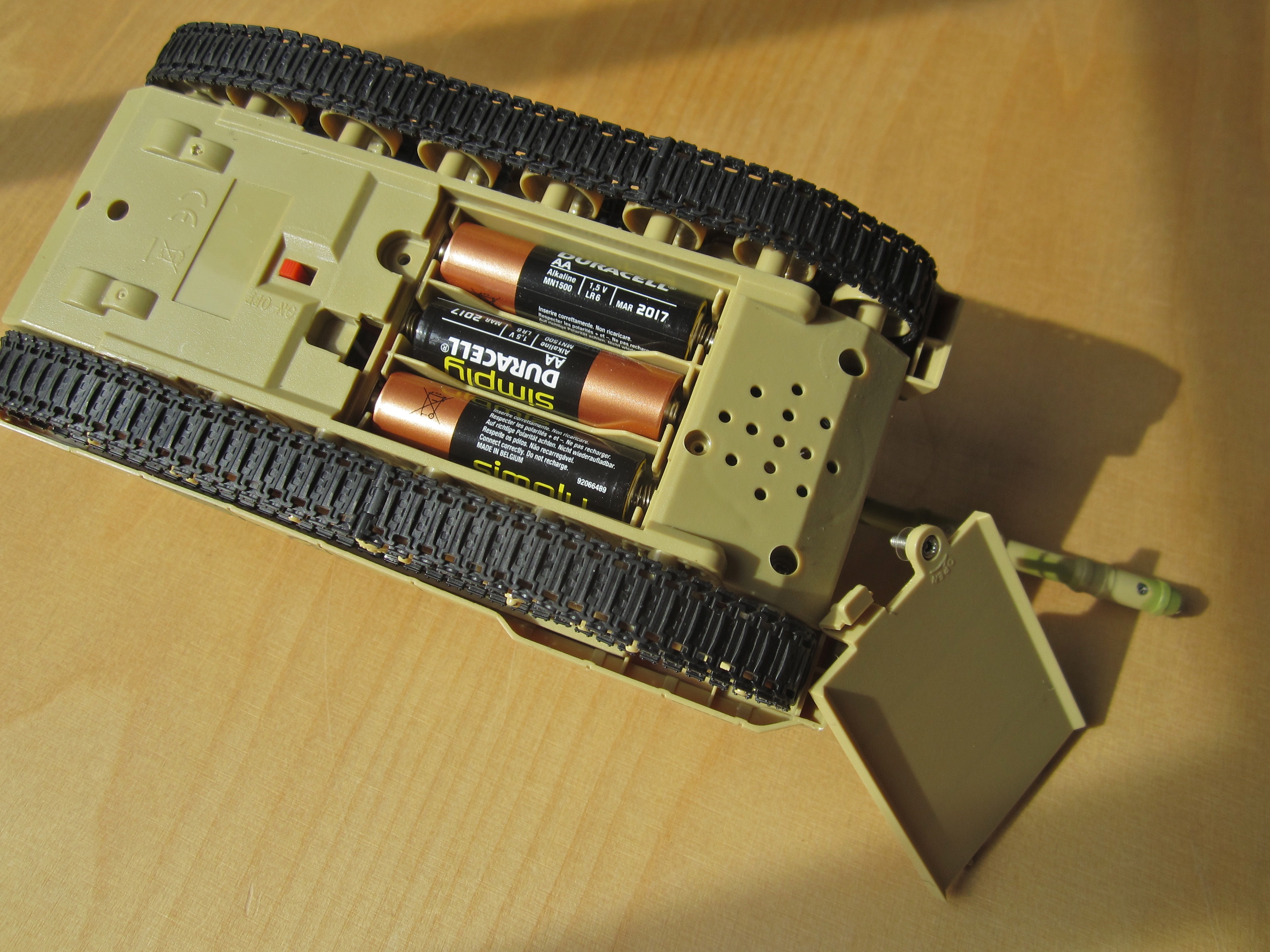 Ist diese Hürde genommen, kann man auch gleich die Batteriefächer aufschrauben, da sich der Hersteller offenbar nicht auf die Halterung nur durch einen Clip verlassen wollte. Die drei pro Panzer benötigten Mignon-Batterien (AA) sind leider nicht im Lieferumfang enthalten. Dafür werden neben Bedienungsanleitungen in Deutsch und Englisch auch zwei Ersatz„ketten“ aus Plastik mitgeliefert.
