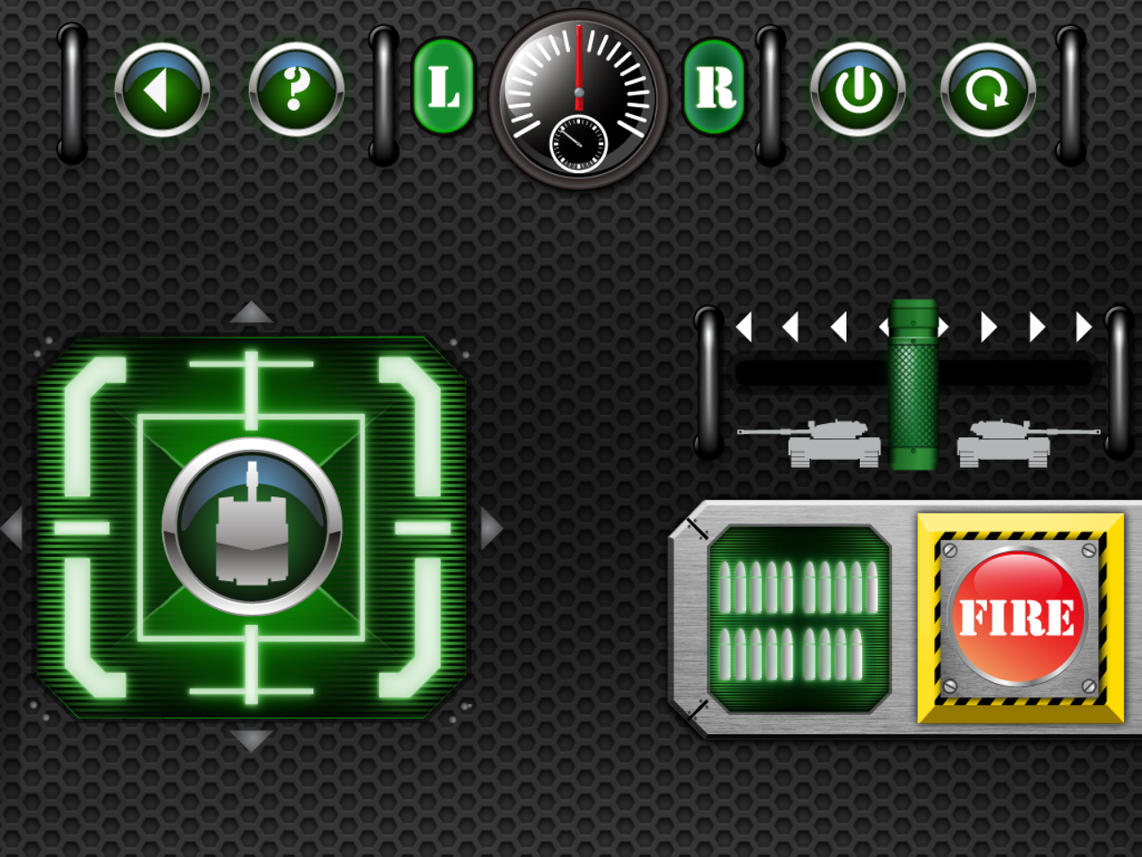 Nun hat man noch die Wahl zwischen Touch- und Motion-Steuerung. Bei der Touchsteuerung bewegt man den Panzer über einen virtuellen Joystick auf dem Display, bei der Motionsteuerung reicht das Neigen des Geräts um das Fahrzeug in Bewegung zu setzem. Bevor sich jedoch irgendetwas regt, muss der Panzer erstmal über die entsprechende Schaltfläche oben rechts gestartet werden.