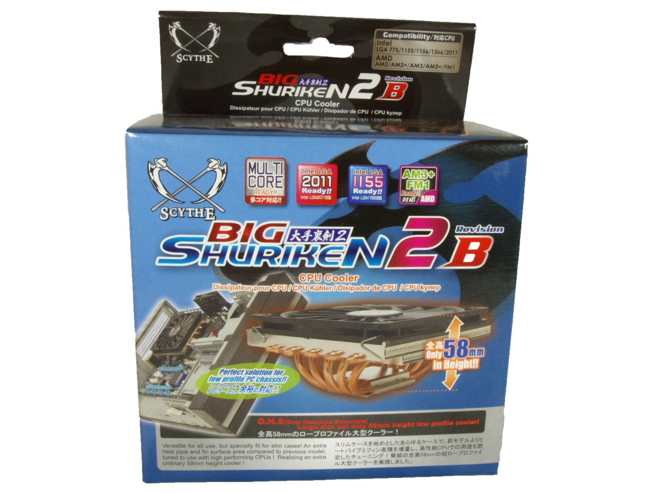Scythe, ein seit Jahren etablierter Hersteller auf dem CPU-Kühler-Markt, verpackt den Big Shuriken 2 in eine kleine bunt-bedruckte Kartonverpackung. Ausgepackt findet man den CPU-Kühler, Montagematerialien für alle aktuell verfügbaren Sockel, Wärmeleitpaste und eine mehrsprachige Anleitung vor. Im Vergleich zum Vorgänger hat Scythe dem „Großen Wurfstern“ in der neuesten Revision eine weitere Heatpipe spendiert.