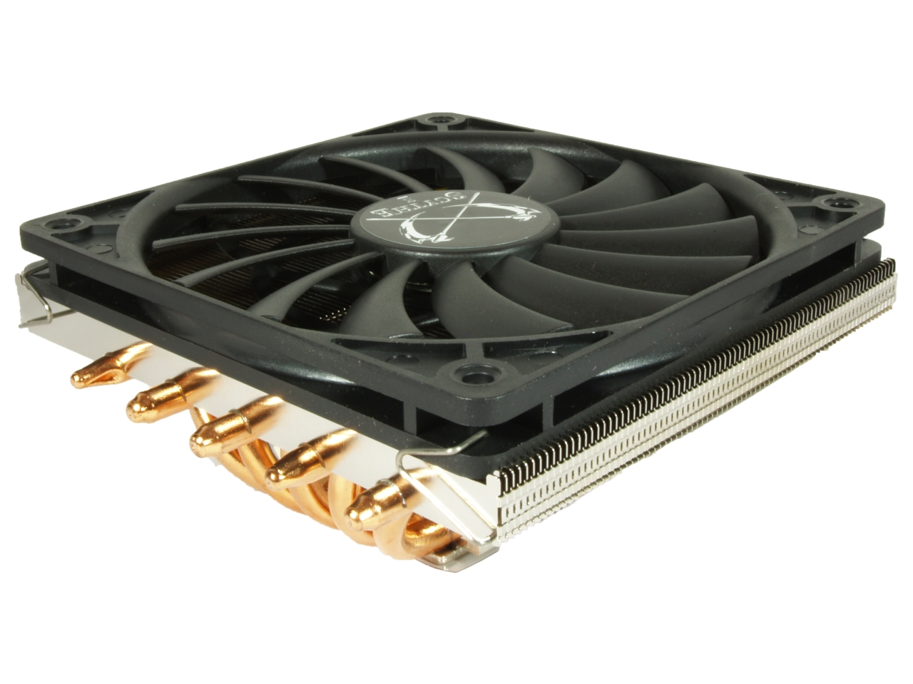 Als Lüfter setzt Scythe den hauseigenen Slip Stream Slim 120 PWM ein. Dieser besitzt die beachtlichen Maße von 120 x 120 x 12 mm, was für einen Kühler in diesem Bereich einmalig ist. Durch die Slim-Bauweise des Lüfters mit 12 mm Höhe weist der Kühler eine gesamte Bauhöhe von gerade einmal 5,8 cm auf. Je nach Bedarf ist der Lüfter zwischen 500 und 2000 Umdrehungen pro Minute regelbar.