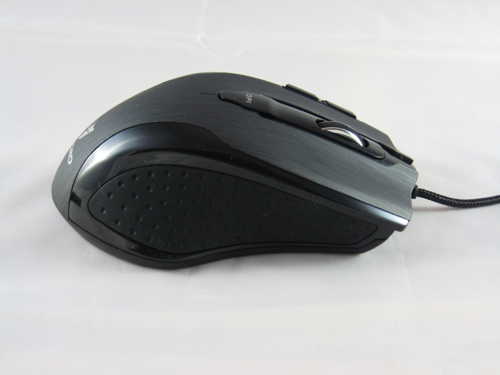 Von oben betrachtet kann man das wertige, aus Metall gefertigte Mausrad und den DPI-Schalter erkennen. Das Mauskabel ist ausreichend lang und komplett ummantelt.