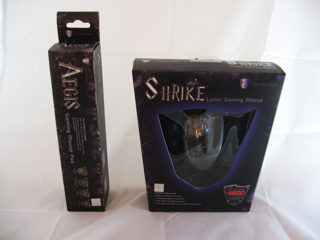 Wie auch bei der Tastatur sind die Verpackungen der beiden Testprodukte in schwarz-lila gehalten. Eingerollt ohne jegliches Zubehör wartet das Aegis Mauspad im Karton auf seinen Auftritt. Der Shrike liegt neben der Anleitung und einer Treiber-CD noch eine Gewichte-Box bei. Ersatzmausfüße und eine praktische Transporttasche fehlen leider.
