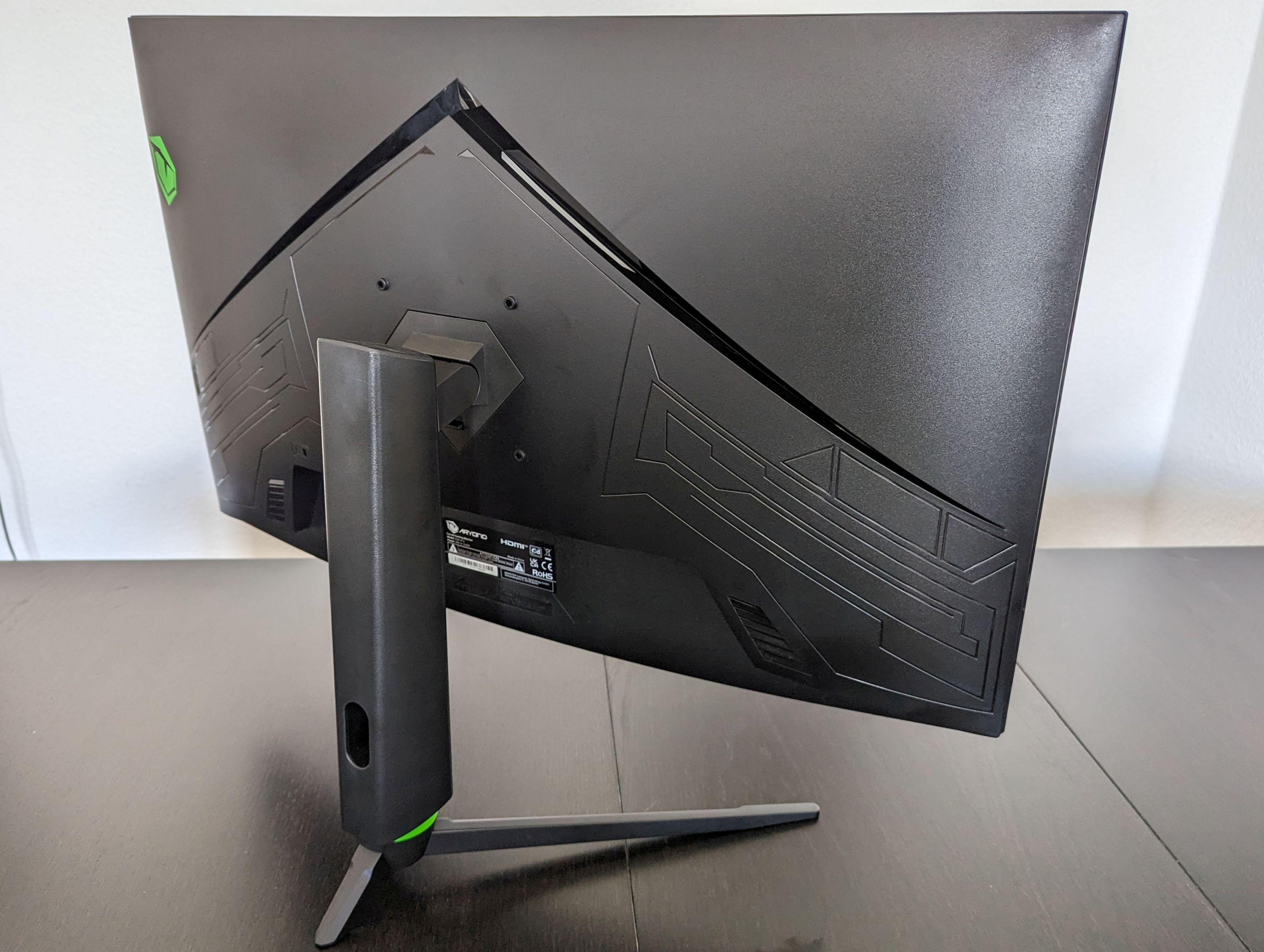 Was das Design betrifft, so hält sich Tulpar beim Aryond A32 etwas zurück. Farblich dominiert Schwarz. Vorne sieht man neben dem recht schmalen Rahmen (ca. 8 mm) an der Unterkante einen knallgrünen "Aryond"-Schriftzug. Die Rückseite ist hier schon auffallender gestaltet: Kantige Gravierungen, das Tulpar-Logo und eine im Gehäuse eingelassene RGB-Beleuchtung lassen keine Zweifel aufkommen, dass es sich hier um einen Gaming-Monitor handelt. Das matte Display hat mit Spiegelungen durch Sonne und Licht kein Problem.