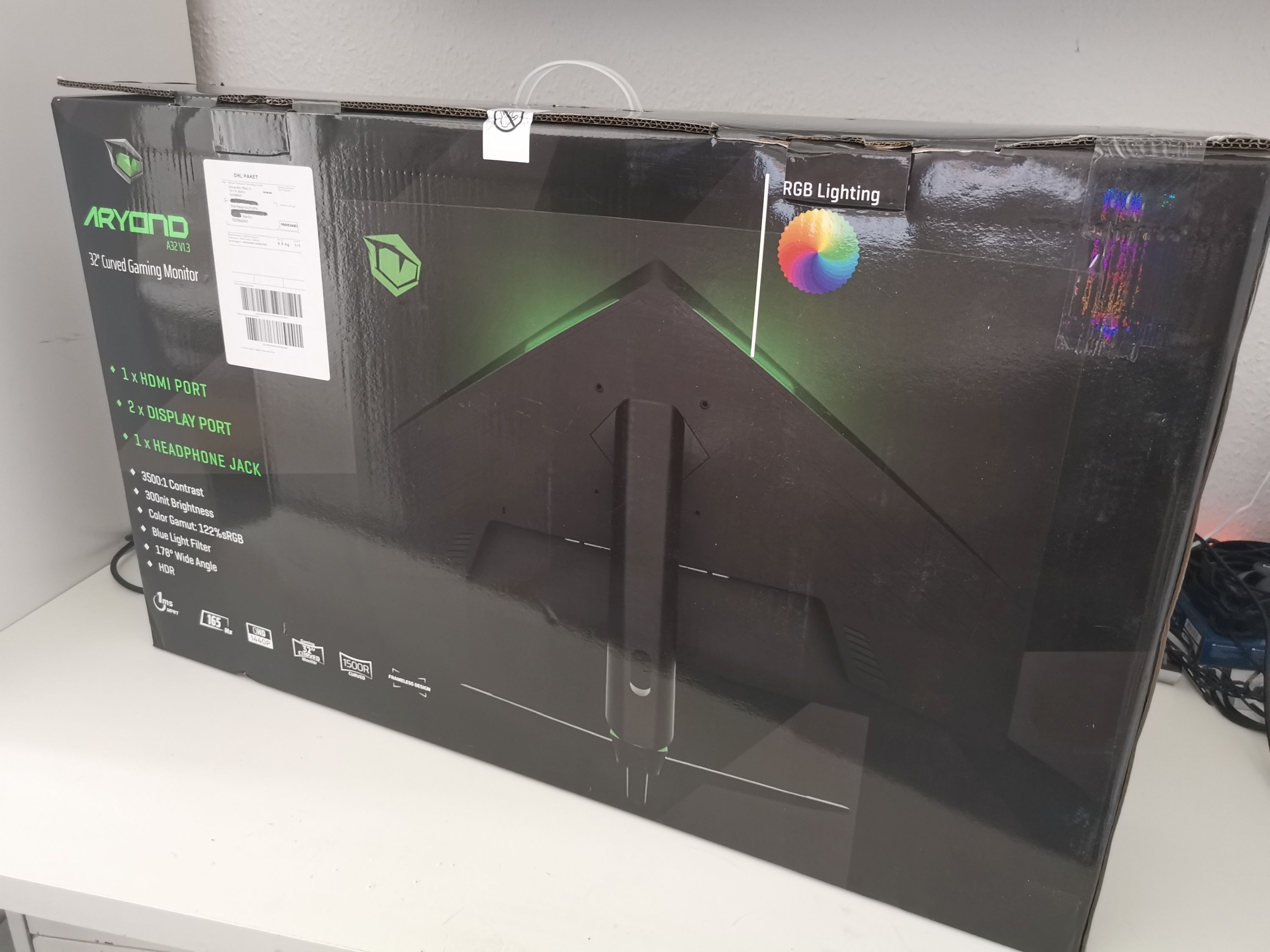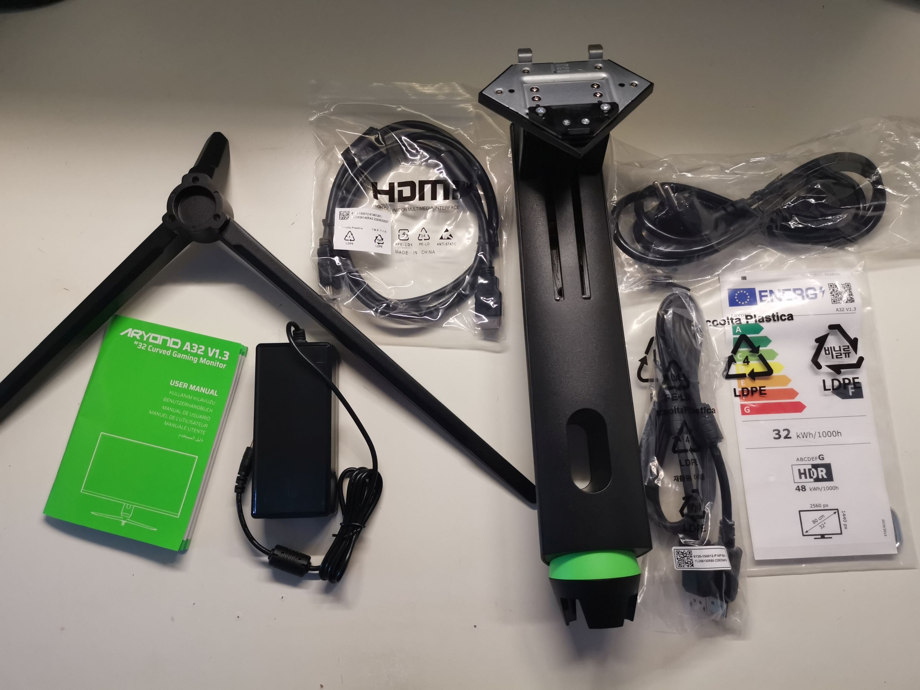 Gut verpackt in einem großen Karton in den Tulpar-Farben Schwarz-Grün erreichte uns der Aryond A32 V1.3 Gaming-Monitor. Im Lieferumfang befindet sich neben dem zweiteiligen Standfuß das externe Netzteil ein HDMI-2.0-, ein DisplayPort-1.3-Kabel und ein Kaltgerätestecker - also alles Wichtige, was zum Start benötigt wird.