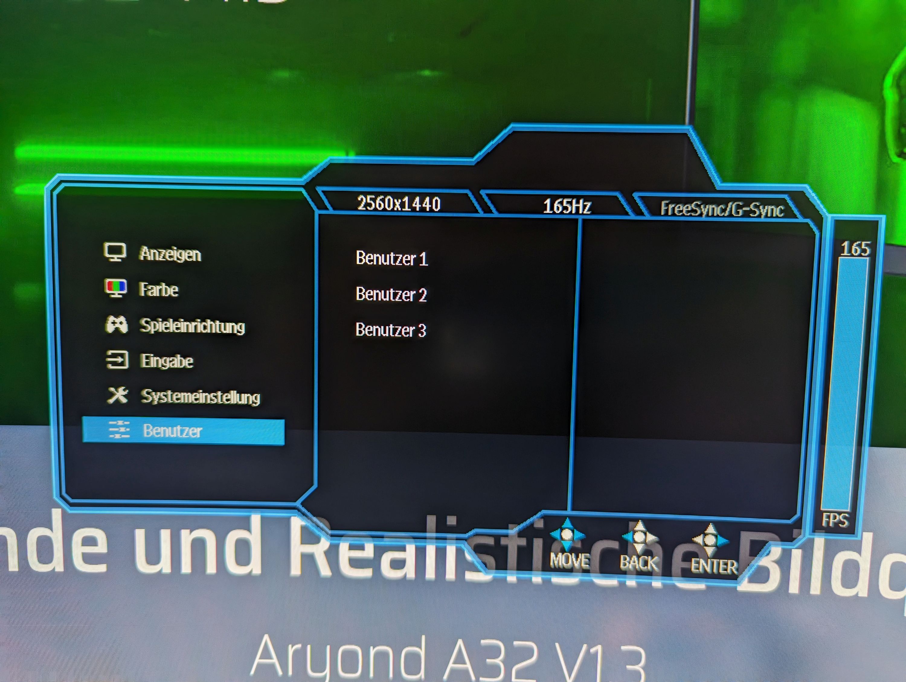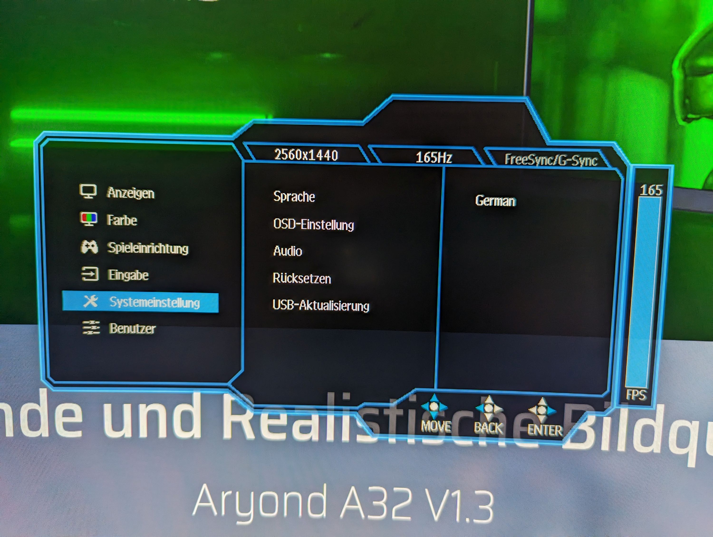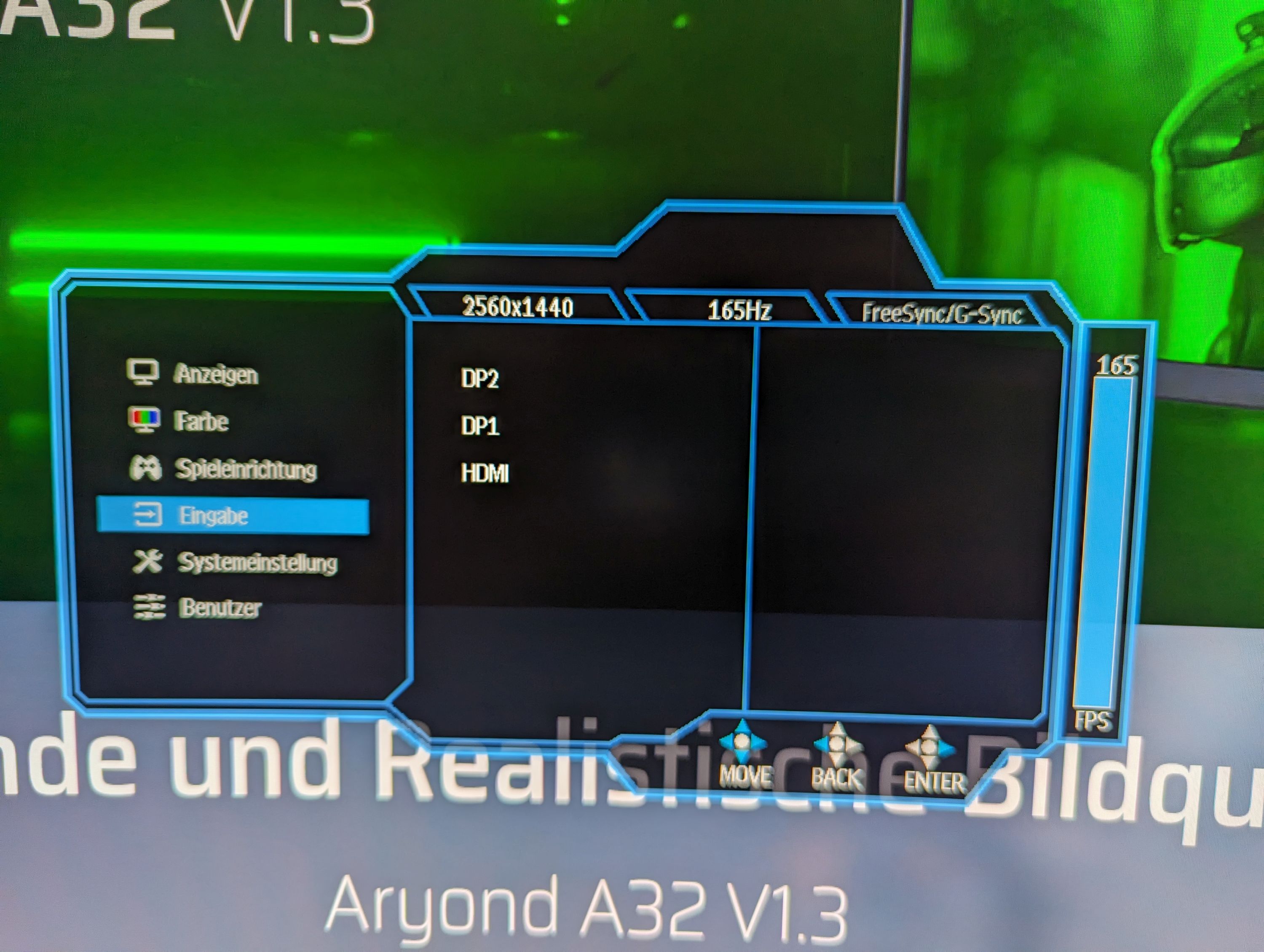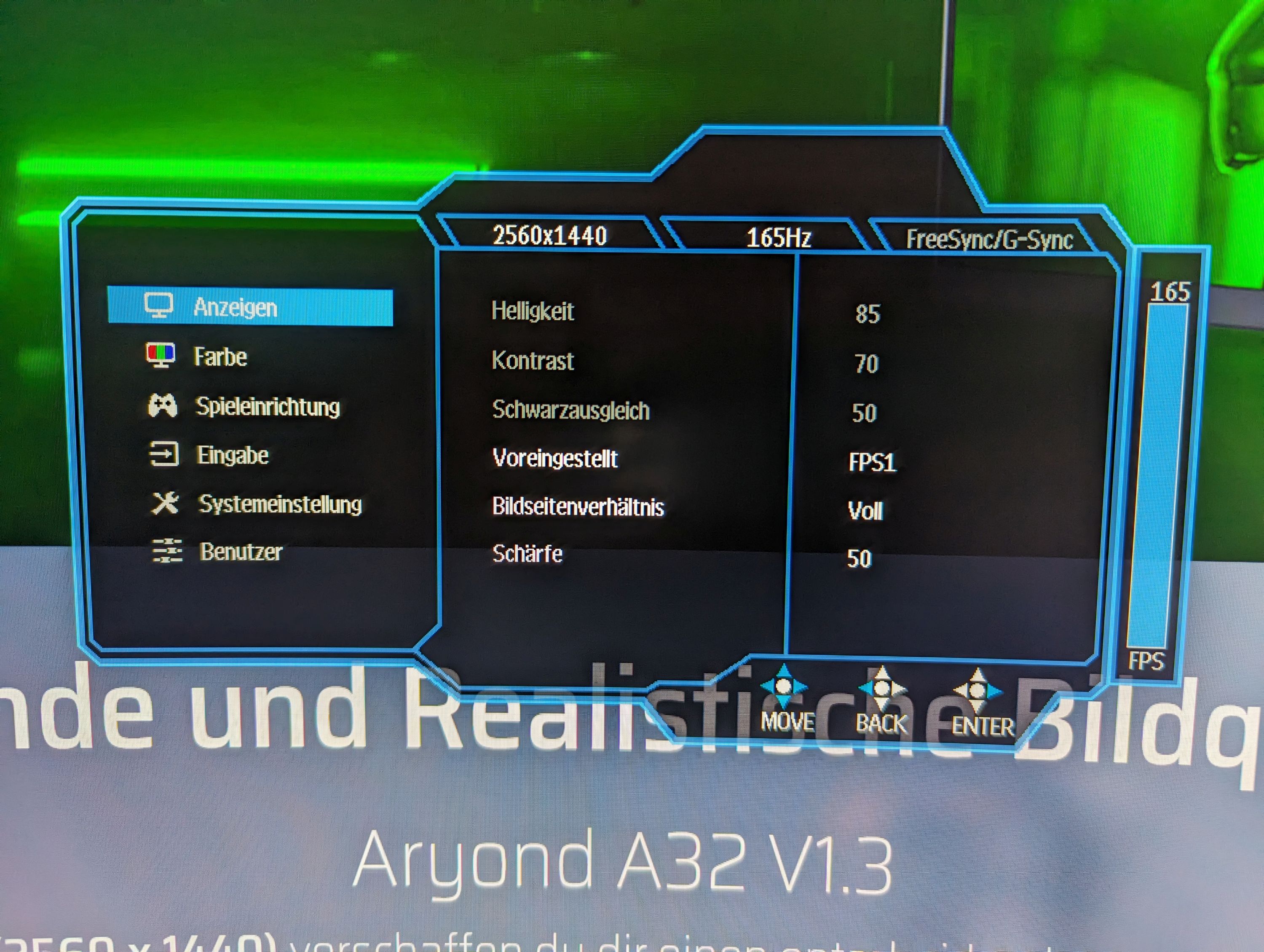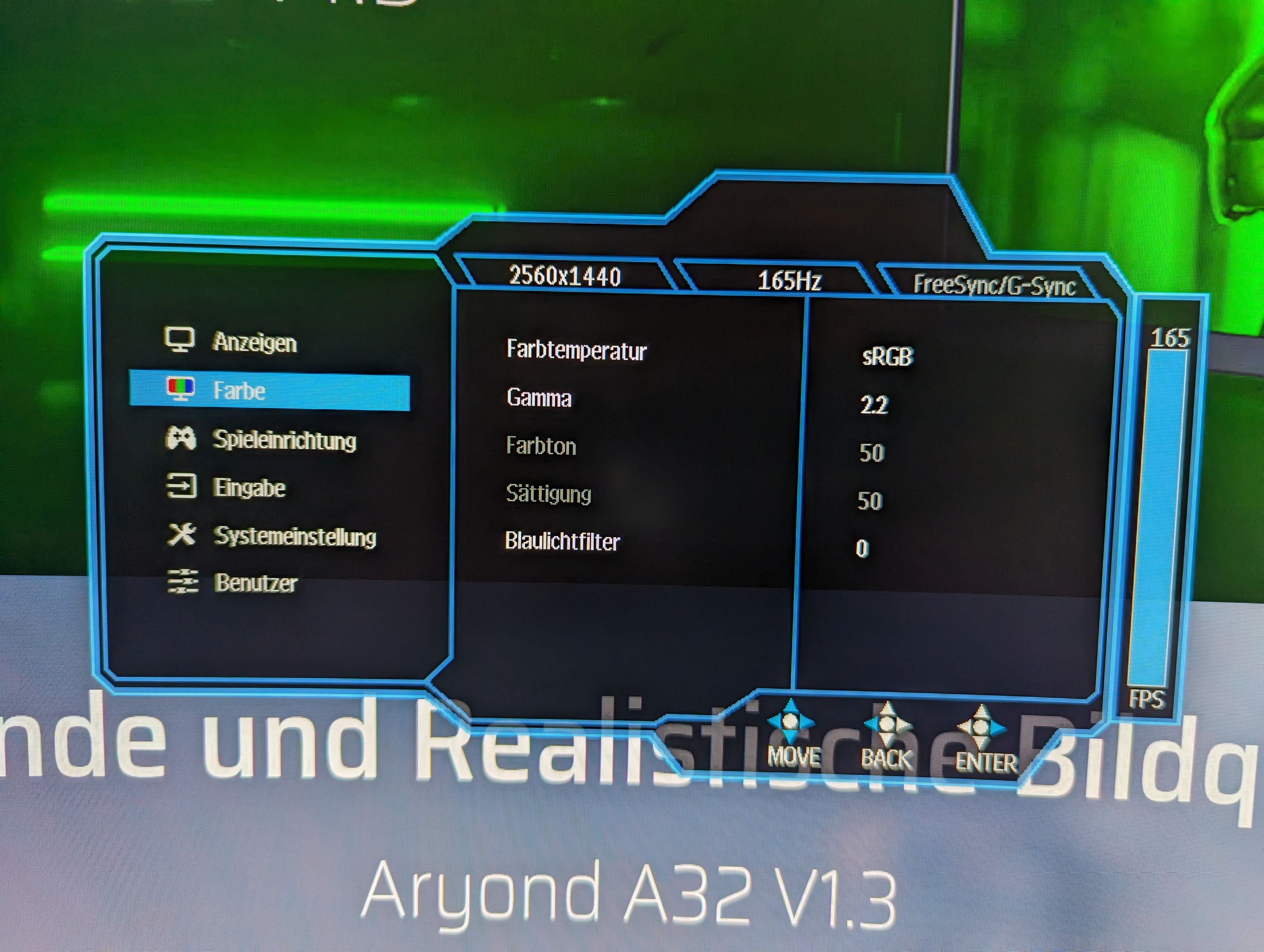 In Spielen überzeugte der Aryond A32 fast auf ganzer Linie. Die 165 Hz lassen sich einfach im Treiber oder im Windows aktivieren. Das Bild ist nicht nur schön groß und flüssig, sondern auch die Farben sind (nach etwas Nachjustierung über den Grafikkarten-Treiber) sehr knackig. Wieso aber nur "fast" auf ganzer Linie? Das verbaute VA-Panel zeigte sich nicht immer von der schnellen Seite. Ab und an konnten wir Schlieren in Spielen feststellen, besonders bei schnellen Bewegungen bei bunten Texturen in Ego-Shootern. Dem kann man ein wenig durch Aktivierung der Overdrive-Funktion (auf hoch) und von MRPT über das OSD-Menü entgegenwirken. So konnten wir die Schlieren auf ein Minimum reduzieren, aber nicht vollends beseitigen.
