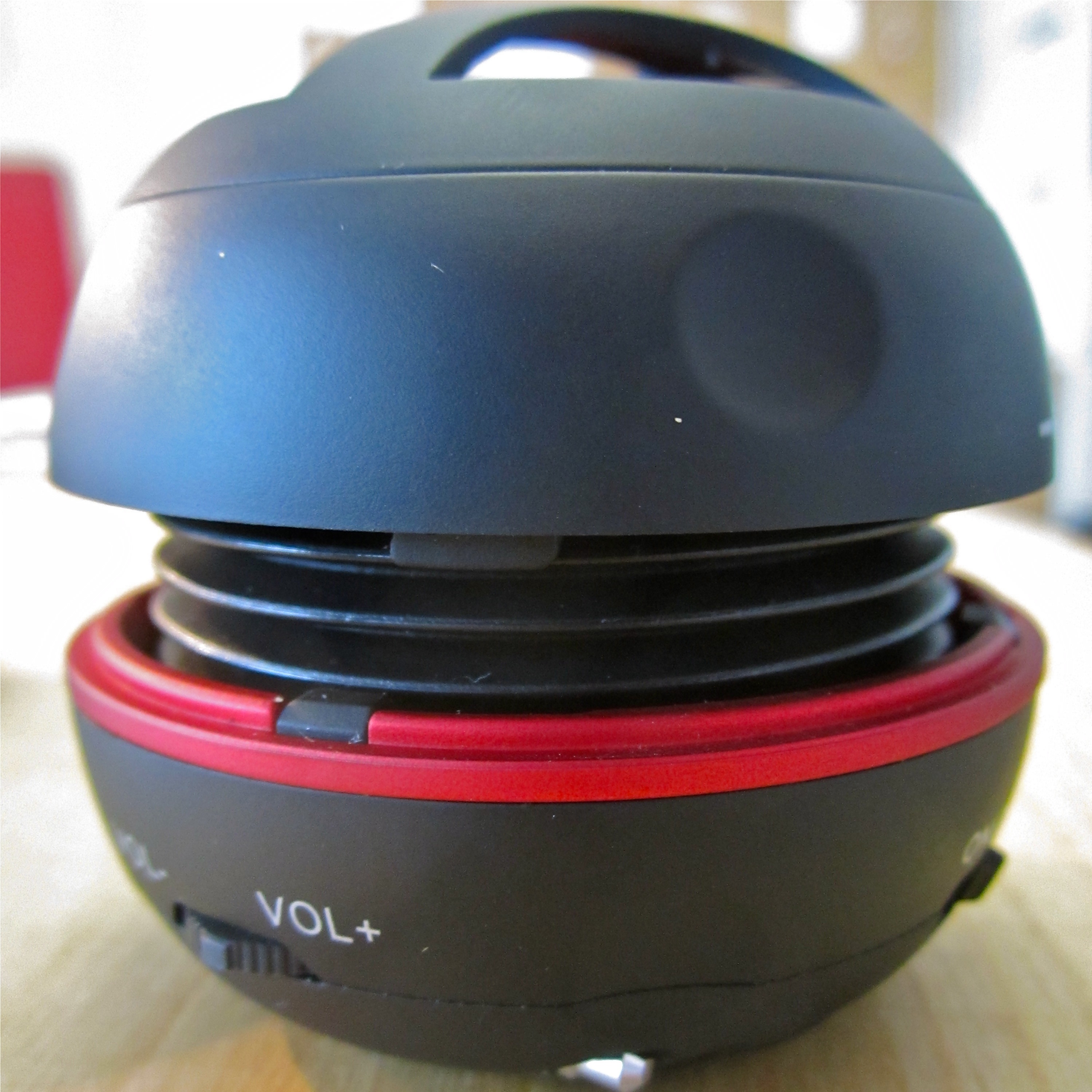 Das Modell von Raikko wirkt ein bisschen wie der große Bruder des X-Mini. Raikko setzt auf die gleiche Mechanik zur Volumenvergrößerung, der Durchmesser des Lautsprechers ist aber etwas größer. Auch der Lautstärkeregler ist kein Drehpotentiometer wie beim X-mini sondern ein Schalter, der die Lautstärke stufenweise erhöht bzw. verringert. Nach dem Aus- und Wiedereinschalten ist die Lautstärke auf Mittelstellung zurückgesetzt, so dass man jedes Mal wieder manuell korrigieren muss. Da ist die Lösung des X-mini bequemer.